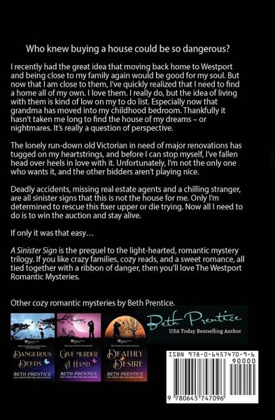 Who knew buying a house could be so dangerous? I recently had the great idea that moving back home to Westport and being close to my family again would be good for my soul. But now that I'm back and sharing my space with Grandma, it's clear I need my own home. ASAP. I adore my family, but cohabitation isn't on my bucket list, especially now that Grandma's claimed my childhood bedroom. But lo and behold, I've stumbled upon a house that's either my dream come true or a full-blown nightmare. It's all about perspective. The lonely run-down old Victorian in need of major renovations has tugged on my heartstrings, and before I can stop myself, I've fallen head over heels in love with it. Unfortunately, I'm not the only one who wants it, and the other bidders aren't playing nice. Deadly accidents, missing real estate agents and a chilling stranger, are all sinister signs that this is not the house for me. Only I'm determined to rescue this fixer upper or die trying. Now all I need to do is to win the auction and stay alive. If only it was that easy... A Sinister Sign is the prequel to the light-hearted, romantic mystery trilogy. If you like crazy families, cozy reads, and a sweet romance, all tied together with a ribbon of danger, then you'll love The Westport Mysteries.