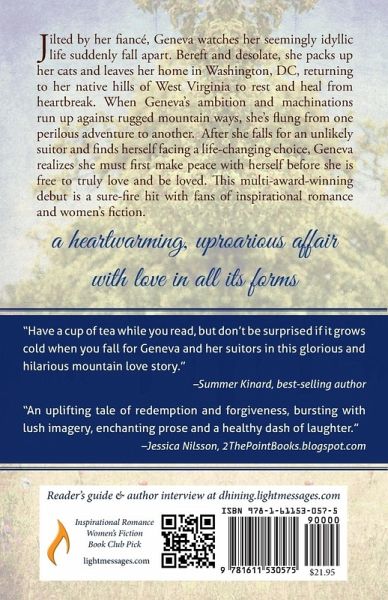 Jilted by her fiancé, Geneva watches her seemingly idyllic life suddenly fall apart. Bereft and desolate, she packs up her cats and leaves her home in Washington, DC, returning to her native hills of West Virginia to rest and heal from heartbreak. When Geneva's ambition and machinations run up against rugged mountain ways, she's flung from one perilous adventure to another. After she falls for an unlikely suitor and finds herself facing a life-changing choice, Geneva realizes she must first make peace with herself before she is free to truly love and be loved. This multi-award-winning debut is a sure-fire hit with fans of inspirational romance and women's fiction.