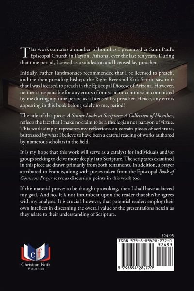 This work contains a number of homilies I presented at Saint Paul's Episcopal Church in Payson, Arizona, over the last ten years. During that time period, I served as a subdeacon and licensed lay preacher. Initially, Father Tantimonaco recommended that I be licensed to preach, and the then-presiding bishop, the Right Reverend Kirk Smith, saw to it that I was licensed to preach in the Episcopal Diocese of Arizona. However, neither is responsible for any errors of omission or commission committed by me during my time period as a licensed lay preacher. Hence, any errors appearing in this book belong solely to me, period! The title of this piece, A Sinner Looks at Scripture: A Collection of Homilies, reflects the fact that I make no claim to be a theologian nor paragon of virtue. This work simply represents my reflections on certain pieces of scripture, buttressed by what I believe to have been a careful reading of works authored by numerous scholars in the field. It is my hope that this work will serve as a catalyst for individuals and/or groups seeking to delve more deeply into Scripture. The scriptures examined in this piece are drawn primarily from both testaments. In addition, a prayer attributed to Francis, along with pieces taken from the Episcopal Book of Common Prayer serve as discussion points in this work too. If this material proves to be thought-provoking, then I shall have achieved my goal. And no, it is not incumbent upon the reader that she/he agrees with my analyses. It is crucial, however, that potential readers employ their own intellect in discerning the overall value of the presentations herein as they relate to their understanding of Scripture.