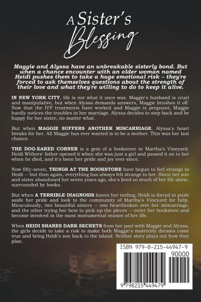 Maggie and Alyssa have an unbreakable sisterly bond. But when a chance encounter with an older woman named Heidi pushes them to take a huge emotional risk -- they're forced to ask themselves questions about the strength of their love and what they're willing to do to keep it alive. In New York City, life is not what it once was. Maggie's husband is cruel and manipulative, but when Alyssa demands answers, Maggie brushes it off. Now that the IVF treatments have worked and Maggie is pregnant, Maggie hardly notices the troubles in her marriage. Alyssa decides to step back and be happy for her sister, no matter what. But when Maggie suffers another miscarriage, Alyssa's heart breaks for her. All Maggie has ever wanted is to be a mother. This was her last chance. The Dog-Eared Corner is a gem of a bookstore in Martha's Vineyard. Heidi Withers' father opened it when she was just a girl and passed it on to her when he died, and it's been her pride and joy ever since. Now fifty-seven, things at the bookstore have begun to feel strange to Heidi -- but then again, everything has always felt strange to her. Since her son and sister abandoned her seven years ago, she's lived so much of her life alone, surrounded by books. But when a terrible diagnosis leaves her reeling, Heidi is forced to push aside her pride and look to the community of Martha's Vineyard for help. Miraculously, two beautiful sisters -- one heartbroken over her miscarriage, and the other trying her best to pick up the pieces -- enter her bookstore and become involved in the most monumental season of her life. When Heidi shares dark secrets from her past with Maggie and Alyssa, the girls decide to take a risk to make both Maggie's maternity dreams come true and bring Heidi's son back to the island. Neither story plays out how they plan. Dive into book ten of The Katama Bay Series, a heartwarming journey of motherly and sisterly love, healing, and promise for better days, all on the island of Martha's Vineyard, with its gorgeous ocean views, its endless summer days, and its bubbly cast of islanders.