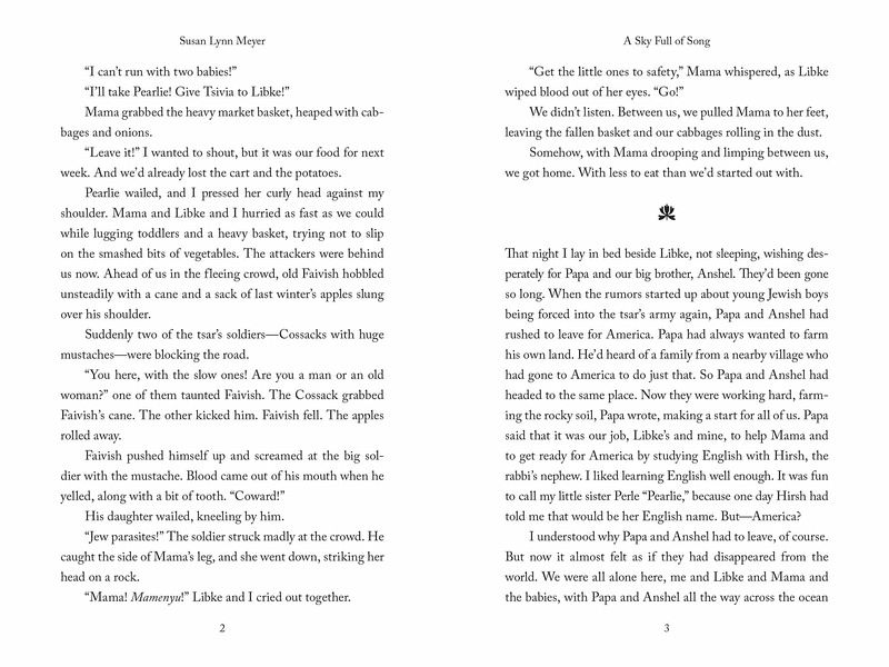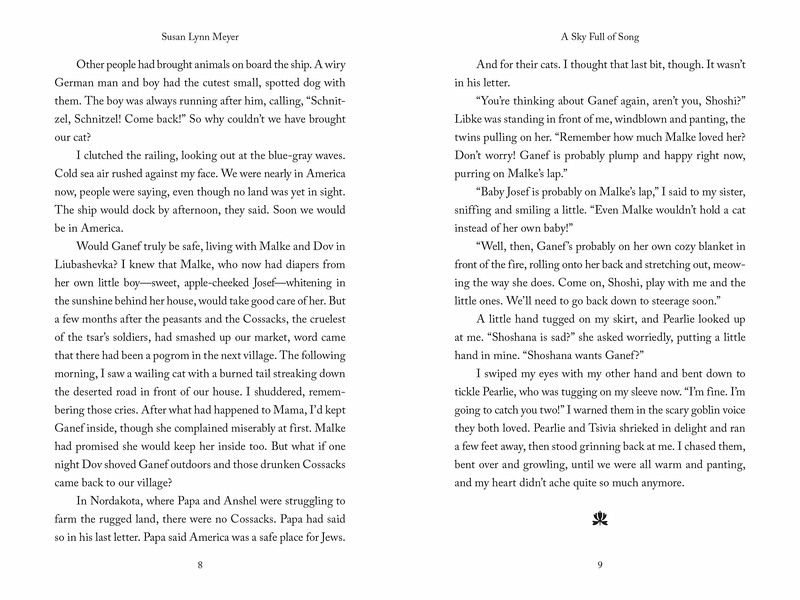 This heartwarming, beautifully written middle-grade historicalnovel about an untold American frontier story is destined to be a cherished classic. North Dakota, 1905 After fleeing persecution in the Russian Empire, eleven-year-old Shoshana and her family, Jewish immigrants, start a new life on the prairie. Shoshana takes fierce joy in the wild beauty of the plains and the thrill of forging a new, American identity. But it’s not as simple for her older sister, Libke, who misses their Ukrainian village and doesn’t pick up English as quickly or make new friends as easily. Desperate to fit in, Shoshana finds herself hiding her Jewish identity in the face of prejudice, just as Libke insists they preserve it. For the first time, Shoshana is at odds with her beloved sister, and has to look deep inside herself to realize that her family’s difference is their greatest strength. By listening to the music that’s lived in her heart all along, Shoshana finds new meaning in the Jewish expression all beginnings are difficult, as well as in the resilience and traditions her people have brought all the way to the North Dakota prairie.