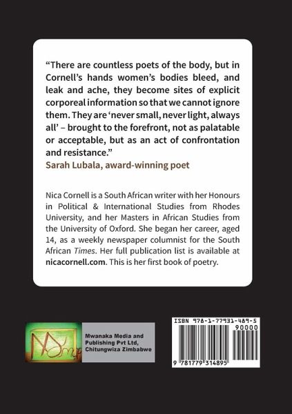 'There are countless poets of the body, but in Cornell's hands women's bodies bleed, and leak and ache, they become sites of explicit corporeal information so that we cannot ignore them. They are "never small, never light, always all" - brought to the forefront, not as palatable or acceptable, but as an act of confrontation and resistance.' - Sarah Lubala, award-winning poet Nica Cornell is a South African writer with a Masters in African Studies from the University of Oxford. She began her career, aged 14, as a weekly newspaper columnist for the South African Times. This is her first book of poetry.