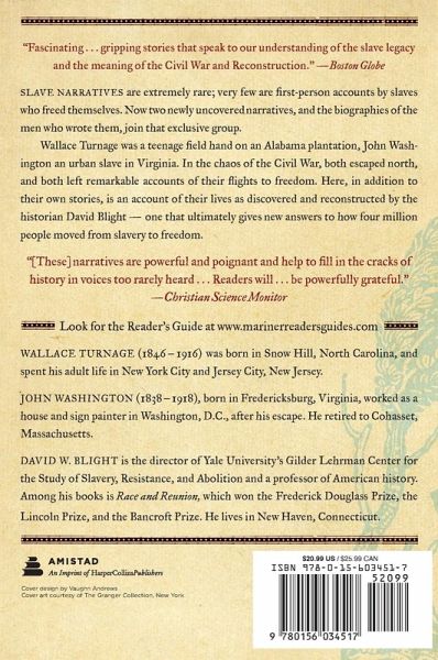Slave narratives, some of the most powerful records of our past, are extremely rare, with only fifty-five post-Civil War narratives surviving. A mere handful are first-person accounts by slaves who ran away and freed themselves. Now two newly uncovered narratives, and the biographies of the men who wrote them, join that exclusive group with the publication of A Slave No More, a major new addition to the canon of American history. Handed down through family and friends, these narratives tell gripping stories of escape: Through a combination of intelligence, daring, and sheer luck, the men reached the protection of the occupying Union troops. David W. Blight magnifies the drama and significance by prefacing the narratives with each man's life history. Using a wealth of genealogical information, Blight has reconstructed their childhoods as sons of white slaveholders, their service as cooks and camp hands during the Civil War, and their climb to black working-class stability in the north, where they reunited their families. In the stories of Turnage and Washington, we find history at its most intimate, portals that offer a rich new answer to the question of how four million people moved from slavery to freedom. In A Slave No More, the untold stories of two ordinary men take their place at the heart of the American experience.