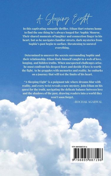 A Sleeping Eight is a captivating romantic thriller that follows Ethan, a man whose heart is captivated by Sophie. Their shared moments of laughter and connection linger in his mind, but as he navigates familiar streets, dark mysteries from Sophie's past begin to surface, threatening to unravel everything. Determined to uncover the secrets surrounding Sophie and their relationship, Ethan finds himself entangled in a web of love, longing, and hidden truths. When unexpected challenges arise, he must confront his deepest fears and decide if love is worth the fight. As he grapples with the tension between memories and reality, he embarks on a journey that will test the limits of his heart. A Sleeping Eight weaves together lyrical prose and evocative imagery, exploring a love that defies the boundaries of time and reality. This book blends romance with suspense, offering a mesmerizing portrait of a love that feels as infinite as it is elusive. Perfect for readers who cherish romantic tales with a hint of mystery, A Sleeping Eight invites you to discover a world where love transcends both dreams and reality.