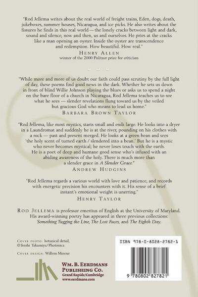 A Slender Grace is Rod Jellema's first collection of poetry since his highly praised The Eighth Day appeared almost twenty years ago. In this volume, which consists of 67 poems, almost all of them new, Jellema confronts a culture that loves bigness with poems that notice what is slender -- the thin lines, the threads by which some things hang, the narrow crevices through which divine grace offers to reconcile humans to each other and to the Creator. These beautifully crafted pieces are not "religious poems" in the usual sense. As Jellema explains, "These poems individually are not spiritual message-bearers. Still, it is inevitable that my belief in a beautiful world that is broken and divinely redeemed -- though I am not preaching about it -- should be evident throughout." And it is, as Jellema takes a second, deeper look at such things as green beans in all their glory, a lovesick lonely young man in a Laundromat, and his own sense of the world while snorkeling in the Red Sea.