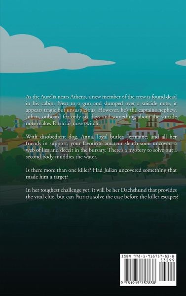 As the Aurelia nears Athens, a new member of the crew is found dead in his cabin. Next to a gun and slumped over a suicide note, it appears tragic but unsuspicious. However, he's the captain's nephew, Julien, onboard for only six days and something about the suicide note makes Patricia's nose twitch. With disobedient dog, Anna, loyal butler, Jermaine, and all her friends in support, your favourite amateur sleuth soon uncovers a web of lies and deceit in the bursary. There's a mystery to solve for sure but a second body muddies the water. Is there more than one killer? Had Julien uncovered something that made him a target? In her toughest challenge yet, it will be her Dachshund that provides the vital clue, but can Patricia solve the case before the killer escapes?
