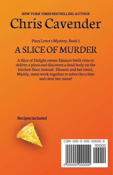 A SLICE OF MURDER by Chris Cavender (Pizza Lover's Mystery Book 1) From the Pizza Lover's Mysteries, first published by Kensington. Praise for A SLICE OF MURDER "Pizza lovers will relish Cavender's delightful first in a new cozy series." Publisher's Weekly "Cavender introduces a promising cast of characters." Booklist "A delightful mystery-as filling as a big slice of warm pizza." Armchair Detective "Saucy debut…with all the ingredients needed for an enjoyable treat" Lesa's Book Critiques "Cavender is an ace at writing cozies." Library Journal When pizzeria owner Eleanor Swift steps in for her delivery driver at the last second, she doesn't expect to find the dead body of Richard Olsen on the kitchen floor with a knife plunged into his chest. To make matters worse, the murder victim recently made a drunken pass at Eleanor in public a few days before the crime, and when her high school sweetheart and the current chief of police Kevin Hurley starts to investigate, Eleanor begins to realize that she must solve the crime herself to clear her name. She reluctantly enlists the help of her sassy sister, Maddy, and the two of them start digging into who might have wanted to see Richard Olsen dead. Homemade pizza dough and sauce recipes included!
