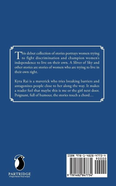 This debut collection of stories portrays women trying to fight discrimination and champion women's independence to live on their own. A Sliver of Sky and other stories are stories of women who are trying to live in their own right. Kyra Rai is a maverick who tries breaking barriers and antagonizes people close to her along the way. It makes a reader feel that maybe this is me or the girl next door. Poignant, full of humour, the stories touch a chord...
