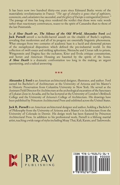 It has been now two hundred thirty-one years since Edmund Burke wrote of the materialistic revolutionaries in France: "The age of chivalry is gone; that of sophisters, economists, and calculators has succeeded, and the glory of Europe is extinguished forever." The passage of time has long since rendered the verdict that those were vatic words rather than reactionary contrivances, nearer to the spirit of Cassandra than to those of the last Pisistratids. In A Slow Death or, The Silence of the Old World, Alexander Ford and Jack Parnell unveil a no-holds-barred assault on the citadels of Burke's sophists, revealing that modernism and all of its progeny are essentially linguistic phenomena. What emerges from two centuries of academic haze is a lucid and elemental picture of the metaphysical disposition which defined the pre-industrial world. In this collection of swift essays and striking aphorisms, Nietzsche and Cioran talk to priests, Wittgenstein and Dugina face the eschaton, Krier and Evola critique consumerism, and Soviet and American Housing are haunted by the spirits of the home. A Slow Death is a dramatic confrontation too long in the making, an urgent questioning, and a radical answering.