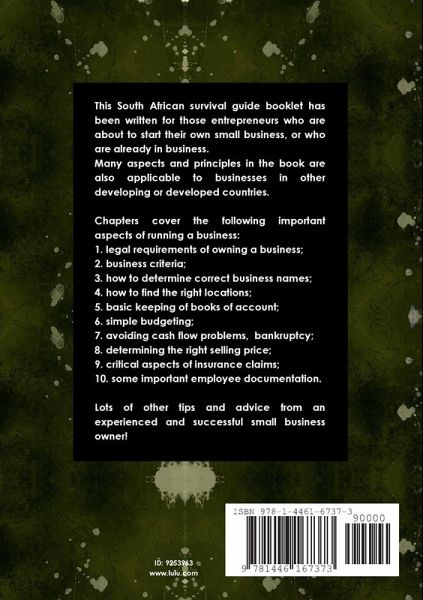 A small business owners handbook. This South African survival guide booklet has been written for those entrepreneurs who are about to start, or who have just started their own small businesses and are still learning the ropes. Many aspects of the book are also applicable to businesses in other developed or developing countries. The author has attempted to write this booklet in plain understandable English. Chapters cover the following day-to-day obstacles of running a business: ¿ legal requirements of owning a business; ¿ critical business criteria; ¿ how to determine correct business names; ¿ how to find the right locations; ¿ basic keeping of books of account; ¿ simple budgeting; ¿ avoiding cash flow problems & bankruptcy; ¿ determining the right selling price; ¿ critical aspects of insurance claims; ¿ strategic planning for survival; ¿ websites,social media and new ways of advertising; ¿ important employee & other documentation. Lots more tips and advice from an experienced business owner