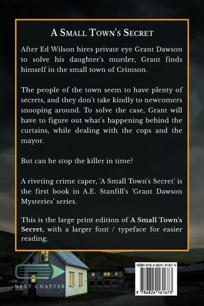 After Ed Wilson hires private eye Grant Dawson to solve his daughter's murder, Grant finds himself in the small town of Crimson. The people of the town seem to have plenty of secrets, and they don't take kindly to newcomers snooping around. To solve the case, Grant will have to figure out what's happening behind the curtains, while dealing with the cops and the mayor. But can he stop the killer in time? A riveting crime caper, 'A Small Town's Secret' is the first book in A.E. Stanfill's 'Grant Dawson Mysteries' series. This is the large print edition of A Small Town's Secret, with a larger font / typeface for easier reading.