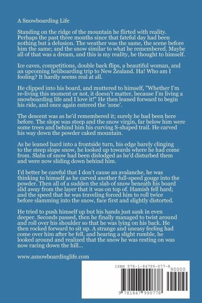 He has been living "A Snowboarding Life" for as long as he can remember. The whole point of his being in the mountains and the whole point of living is to ride his snowboard. We meet Hamish as he stands high on a mountainous peak about to drop down into a whirlwind of life changing events that not only threaten his very existence, but thrust self-analysis and doubt upon what was once his very simple, happy, and uncomplicated life.
