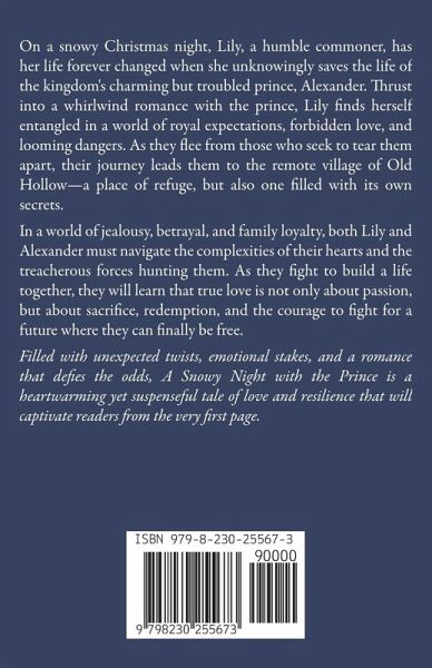 On a snowy Christmas night, Lily, a humble commoner, has her life forever changed when she unknowingly saves the life of the kingdom's charming but troubled prince, Alexander. Thrust into a whirlwind romance with the prince, Lily finds herself entangled in a world of royal expectations, forbidden love, and looming dangers. As they flee from those who seek to tear them apart, their journey leads them to the remote village of Old Hollow-a place of refuge, but also one filled with its own secrets. In a world of jealousy, betrayal, and family loyalty, both Lily and Alexander must navigate the complexities of their hearts and the treacherous forces hunting them. As they fight to build a life together, they will learn that true love is not only about passion, but about sacrifice, redemption, and the courage to fight for a future where they can finally be free. Filled with unexpected twists, emotional stakes, and a romance that defies the odds, A Snowy Night with the Prince is a heartwarming yet suspenseful tale of love and resilience that will captivate readers from the very first page.