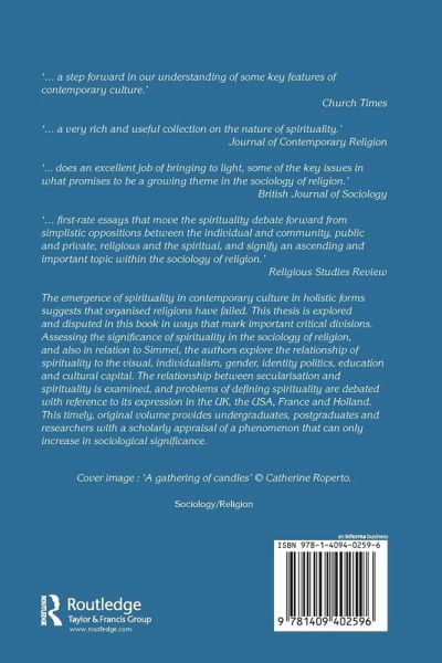 The emergence of spirituality in contemporary culture in holistic forms suggests that organised religions have failed. This thesis is explored and disputed in this book in ways that mark important critical divisions. This is the first collection of essays to assess the significance of spirituality in the sociology of religion. The authors explore the relationship of spirituality to the visual, individualism, gender, identity politics, education and cultural capital. The relationship between secularisation and spirituality is examined and consideration is given to the significance of Simmel in relation to a sociology of spirituality. Problems of defining spirituality are debated with reference to its expression in the UK, the USA, France and Holland. This timely, original and well structured volume provides undergraduates, postgraduates and researchers with a scholarly appraisal of a phenomenon that can only increase in sociological significance.