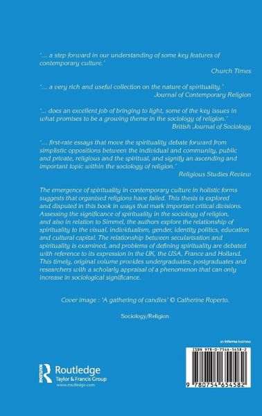 The emergence of spirituality in contemporary culture in holistic forms suggests that organised religions have failed. This thesis is explored and disputed in this book in ways that mark important critical divisions. This is the first collection of essays to assess the significance of spirituality in the sociology of religion. The authors explore the relationship of spirituality to the visual, individualism, gender, identity politics, education and cultural capital. The relationship between secularisation and spirituality is examined and consideration is given to the significance of Simmel in relation to a sociology of spirituality. Problems of defining spirituality are debated with reference to its expression in the UK, the USA, France and Holland. This timely, original and well structured volume provides undergraduates, postgraduates and researchers with a scholarly appraisal of a phenomenon that can only increase in sociological significance.