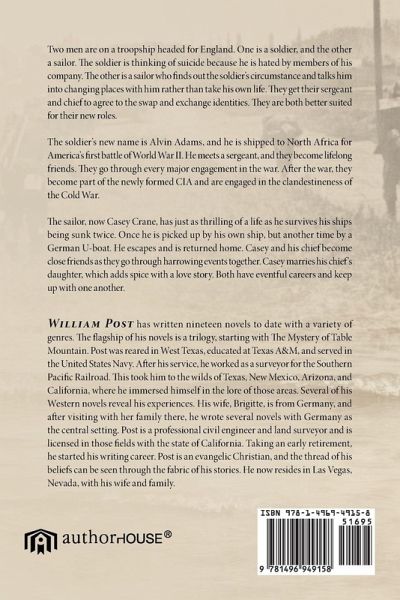 Two men are on a troopship headed for England. One is a soldier, and the other a sailor. The soldier is thinking of suicide because he is hated by members of his company. The other is a sailor who finds out the soldier's circumstance and talks him into changing places with him rather than take his own life. They get their sergeant and chief to agree to the swap and exchange identities. They are both better suited for their new roles. The soldier's new name is Alvin Adams, and he is shipped to North Africa for America's first battle of World War II. He meets a sergeant, and they become lifelong friends. They go through every major engagement in the war. After the war, they become part of the newly formed CIA and are engaged in the clandestineness of the Cold War. The sailor, now Casey Crane, has just as thrilling of a life as he survives his ships being sunk twice. Once he is picked up by his own ship, but another time by a German U-boat. He escapes and is returned home. Casey and his chief become close friends as they go through harrowing events together. Casey marries his chief's daughter, which adds spice with a love story. Both have eventful careers and keep up with one another.