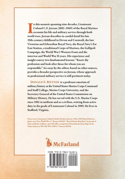In this memoir spanning nine decades, Lieutenant Colonel C.F. Jerram (1882-1969) of the Royal Marines recounts his life and military service through both world wars. Jerram describes in candid detail his late 19th-century childhood in Devon and Cornwall, the late Victorian and Edwardian Royal Navy, the Royal Navy's Far East Station, a traditional Corps of Marines, the Gallipoli Campaign, the World War I Western Front and the interwar and World War II years. His experience and insight convey two fundamental lessons: "Know thy profession and look after those for whom you are responsible." An essay by the editor, based on other sources, provides a broader perspective on Jerram, whose approach to professional military service is still pertinent today.