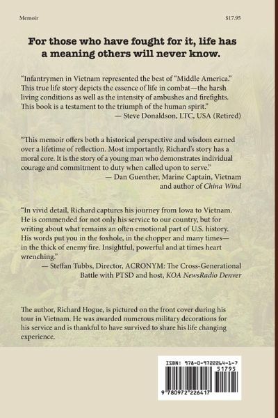 This book details what was asked of young men who were thrown into combat during America's most controversal war - Vietnam. The transition of a young man's peaceful life in Iowa to facing firefights and booby traps in Vietnam is described along with the sorrow of seeing friends killed and seriously wounded in battle. The harshness of the living conditions and the intensity of combat are depicted along with the emotional impact of those experiences. It is the story of a young man who demonstrates individual courage and commitment to duty when called to serve. The author's words put you in the foxhole, in the choper, and many times, in the thick of enemy fire. Insiteful, powerful and at times heart wrenching, The author also shares his personal battel to overcome seriousl physidal injuries after being wounded in action. This book is a testament to the triumph of the human spirit.