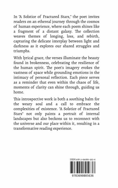 In "A Solstice of Fractured Stars," the poet invites readers on an ethereal journey through the cosmos of human experience, where each poem shines like a fragment of a distant galaxy. The collection weaves themes of longing, loss, and rebirth, capturing the delicate interplay between light and darkness as it explores our shared struggles and triumphs. With lyrical grace, the verses illuminate the beauty found in brokenness, celebrating the resilience of the human spirit. The poet's imagery evokes the vastness of space while grounding emotions in the intimacy of personal reflection. Each piece serves as a reminder that even within the chaos of life, moments of clarity can shine through, guiding us home. This introspective work is both a soothing balm for the weary soul and a call to embrace the complexities of existence. "A Solstice of Fractured Stars" not only paints a portrait of internal landscapes but also beckons us to reconnect with the universe and our place within it, resulting in a transformative reading experience.