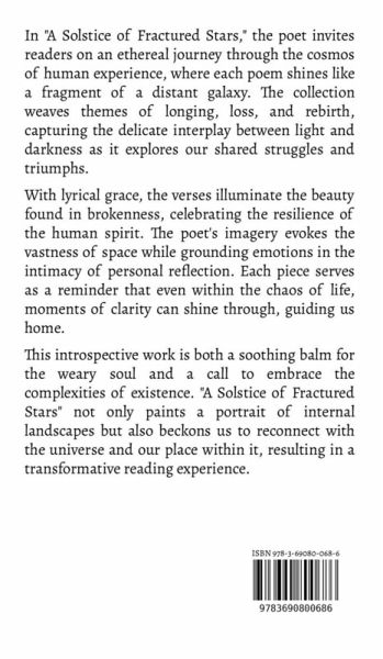 In "A Solstice of Fractured Stars," the poet invites readers on an ethereal journey through the cosmos of human experience, where each poem shines like a fragment of a distant galaxy. The collection weaves themes of longing, loss, and rebirth, capturing the delicate interplay between light and darkness as it explores our shared struggles and triumphs. With lyrical grace, the verses illuminate the beauty found in brokenness, celebrating the resilience of the human spirit. The poet's imagery evokes the vastness of space while grounding emotions in the intimacy of personal reflection. Each piece serves as a reminder that even within the chaos of life, moments of clarity can shine through, guiding us home. This introspective work is both a soothing balm for the weary soul and a call to embrace the complexities of existence. "A Solstice of Fractured Stars" not only paints a portrait of internal landscapes but also beckons us to reconnect with the universe and our place within it, resulting in a transformative reading experience.