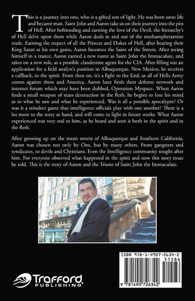 This is a journey into one, who is a gifted son of light. He was born unto life and became man. Saint John and Ian take us on their journey into the pits of Hell. After befriending and earning the love of the Devil, the hierarchy's of Hell delve upon them while Ian deals in and out of the methamphetamine trade. Earning the respect of all the Princes and Dukes of Hell, after beating their King Satan at his own game, Ian becomes the Saint of the Streets. After seeing himself in a trance, Ian earned a new name as Saint John the Immaculate, and takes on a new role, as a possible clandestine agent for the CIA. After filling out an application for a field analyst's position in Albuquerque, New Mexico, he receives a callback, in the spirit. From then on, it's a fight to the End, as all of Hells Army comes against them and America. Ian later finds their defense network and internet forum which may have been dubbed, Operation Myspace. When Ian finds a small weapon of mass destruction in the flesh, he begins to lose his mind as to what he saw and what he experienced. Was it all a possible apocalypse? Or was it a reindeer game that intelligence officials play with one another? There is a lot more to the story at hand, and will come to light in future works. What Ian experienced was very real to him, as he heard and seen it both in the spirit and in the flesh. After growing up on the mean streets of Albuquerque and Southern California, Ian was chosen not only by One, but by many others. From gangsters and syndicates, to devils and Christians. Even the Intelligence community sought after him. For everyone observed what happened in the spirit and now this story must be told. This is the story of Ian and the Triune of Saint John the Immaculate.