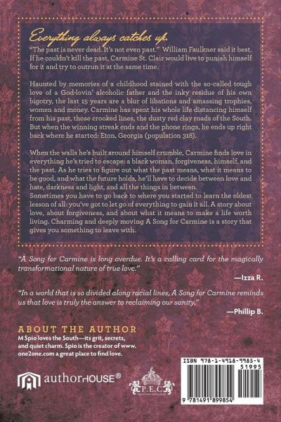Everything always catches up. "The past is never dead. It's not even past." William Faulkner said it best. If he couldn't kill the past, Carmine St. Clair would live to punish himself for it and try to outrun it at the same time. Haunted by memories of a childhood stained with the so-called tough love of a God-lovin' alcoholic father and the inky residue of his own bigotry, the last 15 years are a blur of libations and amassing trophies, women and money. Carmine has spent his whole life distancing himself from his past, those crooked lines, the dusty red clay roads of the South. But when the winning streak ends and the phone rings, he ends up right back where he started: Eton, Georgia (population 318). When the walls he's built around himself crumble, Carmine finds love in everything he's tried to escape: a black woman, forgiveness, himself, and the past. As he tries to figure out what the past means, what it means to be good, and what the future holds, he'll have to decide between love and hate, darkness and light, and all the things in between. Sometimes you have to go back to where you started to learn the oldest lesson of all: you've got to let go of everything to gain it all. A story about love, about forgiveness, and about what it means to make a life worth living. Charming and deeply moving A Song for Carmine is a story that gives you something to leave with.