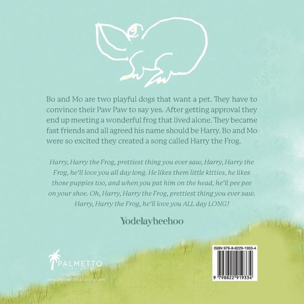 Bo and Mo are two playful dogs that want a pet. They have to convince their Paw Paw to say yes. After getting approval they end up meeting a wonderful frog that lived alone. They became fast friends and all agreed his name should be Harry. Bo and Mo were so excited they created a song called Harry the Frog. Harry, Harry the Frog, prettiest thing you ever saw, Harry, Harry the Frog, he'll love you all day long. He likes them little kitties, he likes those puppies too, and when you pat him on the head, he'll pee pee on your shoe. Oh, Harry, Harry the Frog, prettiest thing you ever saw. Harry, Harry the Frog, he'll love you ALL day LONG! Yodealyheehoo