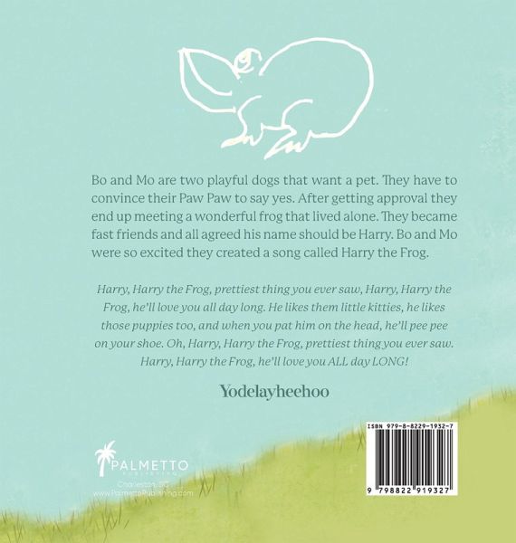 Bo and Mo are two playful dogs that want a pet. They have to convince their Paw Paw to say yes. After getting approval they end up meeting a wonderful frog that lived alone. They became fast friends and all agreed his name should be Harry. Bo and Mo were so excited they created a song called Harry the Frog. Harry, Harry the Frog, prettiest thing you ever saw, Harry, Harry the Frog, he'll love you all day long. He likes them little kitties, he likes those puppies too, and when you pat him on the head, he'll pee pee on your shoe. Oh, Harry, Harry the Frog, prettiest thing you ever saw. Harry, Harry the Frog, he'll love you ALL day LONG! Yodealyheehoo