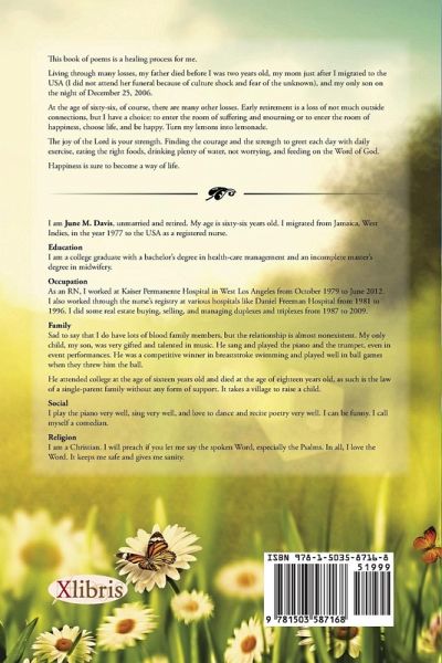 I am June M. Davis, unmarried and retired. My age is sixty-six years old. I migrated from Jamaica, West Indies, in the year 1977 to the USA as a registered nurse. Education I am a college graduate with a bachelor's degree in health-care management and an incomplete master's degree in midwifery. Occupation As an RN, I worked at Kaiser Permanente Hospital in West Los Angeles from October 1979 to June 2012. I also worked through the nurse's registry at various hospitals like Daniel Freeman Hospital from 1981 to 1996. I did some real estate buying, selling, and managing duplexes and triplexes from 1987 to 2009. Family Sad to say that I do have lots of blood family members, but the relationship is almost nonexistent. My only child, my son, was very gifted and talented in music. He sang and played the piano and the trumpet, even in event performances. He was a competitive winner in breaststroke swimming and played well in ball games when they threw him the ball. He attended college at the age of sixteen years old and died at the age of eighteen years old, as such is the law of a single-parent family without any form of support. It takes a village to raise a child. Social I play the piano very well, sing very well, and love to dance and recite poetry very well. I can be funny. I call myself a comedian. Religion I am a Christian. I will preach if you let me say the spoken Word, especially the Psalms. In all, I love the Word. It keeps me safe and gives me sanity.