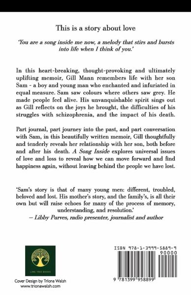 This is a story about love... 'You are a song inside me now, a melody that stirs and bursts into life when I think of you.' In this heart-breaking, thought-provoking and ultimately uplifting memoir, Gill Mann remembers life with her son Sam - a boy and young man who enchanted and infuriated in equal measure. Sam saw colours where others saw grey. He made people feel alive. His unvanquishable spirit sings out as Gill reflects on the joys he brought, the difficulties of his struggles with schizophrenia, and the impact of his death. Part journal, part journey into the past, and part conversation with Sam, in this beautifully written memoir, Gill thoughtfully and tenderly reveals her relationship with her son, both before and after his death. ¿A Song Inside explores universal issues of love and loss to reveal how we can move forward and find happiness again, without leaving behind the people we have lost.