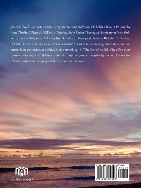 James S. Wolfe is a poet, preacher, programmer, and professor. He holds a B.A. in Philosophy from Oberlin College, an M.Div. in Theology from Union Theological Seminary in New York, and a PhD in Religion and Society from Graduate Theological Union in Berkeley. In "A Song of Faith," Jim articulates a vision which is scientific in its foundation, religious in its aspiration, artistic in its expression, and ethical in its outworking. In "The Gist of the Bible" he offers short commentaries on the 104 best chapters in scripture grouped in pairs by theme. Jim teaches religious studies and sociology at Indianapolis universities.