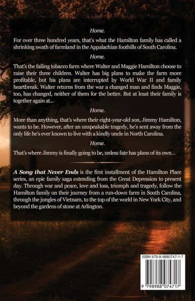 Home. For over three hundred years, that's what the Hamilton family has called a shrinking swath of farmland in the Appalachian foothills of South Carolina. Home. That's the failing tobacco farm where Walter and Maggie Hamilton choose to raise their three children. Walter has big plans to make the farm more profitable, but his plans are interrupted by World War II and family heartbreak. Walter returns from the war a changed man and finds Maggie, too, has changed, neither of them for the better. But at least their family is together again at... Home. More than anything, that's where their eight-year-old son, Jimmy Hamilton, wants to be. However, after an unspeakable tragedy, he's sent away from the only life he's ever known to live with a kindly uncle in North Carolina. Home. That's where Jimmy is finally going to be, unless fate has plans of its own... A Song that Never Ends is the first installment of the Hamilton Place series, an epic family saga extending from the Great Depression to present day. Through war and peace, love and loss, triumph and tragedy, follow the Hamilton family on their journey from a run-down farm in South Carolina, through the jungles of Vietnam, to the top of the world in New York City, and beyond the gardens of stone at Arlington.