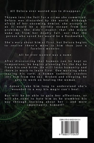 All Delora ever wanted was to disappear. Thrown into the Veil for a crime she committed, Delora was discarded by the world. Although afraid of her oncoming demise, she accepts it as it would be a worldly escape from her problems. She didn't expect that she would wake up from her deadly fall, nor that the person who saved her would be a Duskwalker. She's wary about him at first, but Delora begins to realise there's more to him than just a faceless monster. All he ever wanted was a name. After discovering that humans can be kept as companions, he begins planning for the day he finds his own bride. He still lacks humanity and there is much to learn first. One morning when leaving his cave, a human suddenly crashes into him from the sky. Broken and sleeping, he gets to work on healing the woman. It doesn't take him long to understand she's wounded in a way his magic can't heal. But will he be able to gain her affections, or will she come to hate him as he stumbles his way through learning about her - and more importantly, himself?