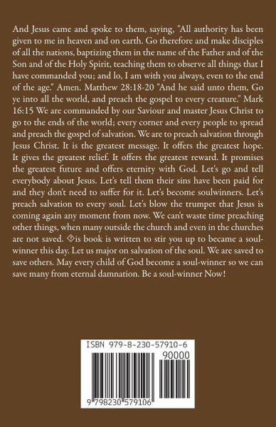 And Jesus came and spoke to them, saying, "All authority has been given to me in heaven and on earth. Go therefore and make disciples of all the nations, baptizing them in the name of the Father and of the Son and of the Holy Spirit, teaching them to observe all things that I have commanded you; and lo, I am with you always, even to the end of the age." Amen. Matthew 28:18-20 "And he said unto them, Go ye into all the world, and preach the gospel to every creature." Mark 16:15 We are commanded by our Saviour and master Jesus Christ to go to the ends of the world; every corner and every people to spread and preach the gospel of salvation. We are to preach salvation through Jesus Christ. It is the greatest message. It offers the greatest hope. It gives the greatest relief. It offers the greatest reward. It promises the greatest future and offers eternity with God. Let's go and tell everybody about Jesus. Let's tell them their sins have been paid for and they don't need to suffer for it. Let's become soulwinners. Let's preach salvation to every soul. Let's blow the trumpet that Jesus is coming again any moment from now. We can't waste time preaching other things, when many outside the church and even in the churches are not saved. ¿is book is written to stir you up to became a soul-winner this day. Let us major on salvation of the soul. We are saved to save others. May every child of God become a soul-winner so we can save many from eternal damnation. Be a soul-winner Now!