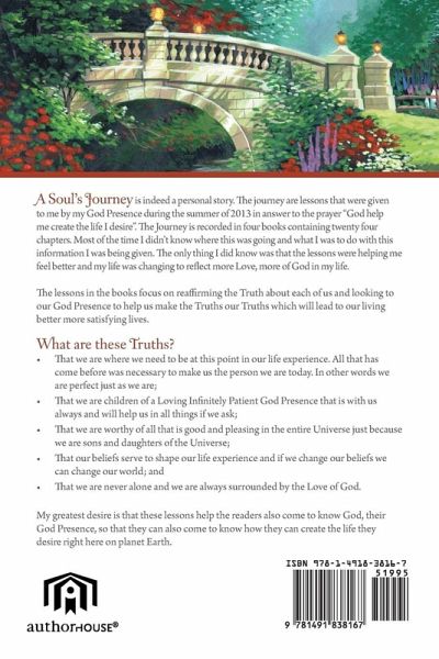 A Soul's Journey is indeed a personal story. The journey are lessons that were given to me by my God Presence during the summer of 2013 in answer to the prayer "God help me create the life I desire". The Journey is recorded in four books containing twenty four chapters. Most of the time I didn't know where this was going and what I was to do with this information I was being given. The only thing I did know was that the lessons were helping me feel better and my life was changing to reflect more Love, more of God in my life. The lessons in the books focus on reaffirming the Truth about each of us and looking to our God Presence to help us make the Truths our Truths which will lead to our living better more satisfying lives. What are these Truths? That we are where we need to be at this point in our life experience. All that has come before was necessary to make us the person we are today. In other words we are perfect just as we are; That we are children of a Loving Infinitely Patient God Presence that is with us always and will help us in all things if we ask; That we are worthy of all that is good and pleasing in the entire Universe just because we are sons and daughters of the Universe; That our beliefs serve to shape our life experience and if we change our beliefs we can change our world; and That we are never alone and we are always surrounded by the Love of God. My greatest desire is that these lessons help the readers also come to know God, their God Presence, so that they can also come to know how they can create the life they desire right here on planet Earth.