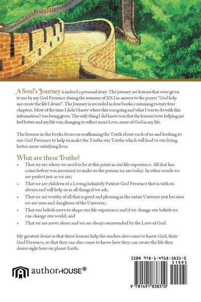 A Soul's Journey is indeed a personal story. The journey are lessons that were given to me by my God Presence during the summer of 2013 in answer to the prayer "God help me create the life I desire". The Journey is recorded in four books containing twenty four chapters. Most of the time I didn't know where this was going and what I was to do with this information I was being given. The only thing I did know was that the lessons were helping me feel better and my life was changing to reflect more Love, more of God in my life. The lessons in the books focus on reaffirming the Truth about each of us and looking to our God Presence to help us make the Truths our Truths which will lead to our living better more satisfying lives. What are these Truths? That we are where we need to be at this point in our life experience. All that has come before was necessary to make us the person we are today. In other words we are perfect just as we are; That we are children of a Loving Infinitely Patient God Presence that is with us always and will help us in all things if we ask; That we are worthy of all that is good and pleasing in the entire Universe just because we are sons and daughters of the Universe; That our beliefs serve to shape our life experience and if we change our beliefs we can change our world; and That we are never alone and we are always surrounded by the Love of God. My greatest desire is that these lessons help the readers also come to know God, their God Presence, so that they can also come to know how they can create the life they desire right here on planet Earth.