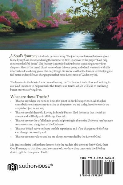 A Soul's Journey is indeed a personal story. The journey are lessons that were given to me by my God Presence during the summer of 2013 in answer to the prayer "God help me create the life I desire". The Journey is recorded in four books containing twenty four chapters. Most of the time I didn't know where this was going and what I was to do with this information I was being given. The only thing I did know was that the lessons were helping me feel better and my life was changing to reflect more Love, more of God in my life. The lessons in the books focus on reaffirming the Truth about each of us and looking to our God Presence to help us make the Truths our Truths which will lead to our living better more satisfying lives. What are these Truths? That we are where we need to be at this point in our life experience. All that has come before was necessary to make us the person we are today. In other words we are perfect just as we are; That we are children of a Loving Infinitely Patient God Presence that is with us always and will help us in all things if we ask; That we are worthy of all that is good and pleasing in the entire Universe just because we are sons and daughters of the Universe; That our beliefs serve to shape our life experience and if we change our beliefs we can change our world; and That we are never alone and we are always surrounded by the Love of God. My greatest desire is that these lessons help the readers also come to know God, their God Presence, so that they can also come to know how they can create the life they desire right here on planet Earth.