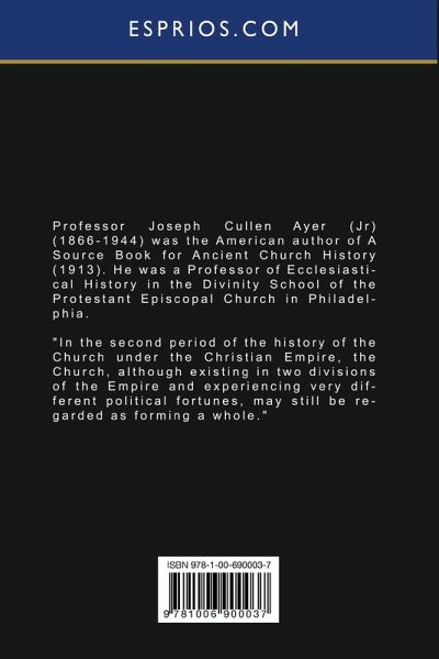 Professor Joseph Cullen Ayer (Jr) (1866-1944) was the American author of A Source Book for Ancient Church History (1913). He was a Professor of Ecclesiastical History in the Divinity School of the Protestant Episcopal Church in Philadelphia. "In the second period of the history of the Church under the Christian Empire, the Church, although existing in two divisions of the Empire and experiencing very different political fortunes, may still be regarded as forming a whole."