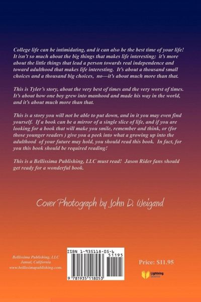 College life can be intimidating, and it can also be the best time of your life! It isn't so much about the big things that makes life interesting; it's more about the little things that lead a person towards real independence and toward adulthood that makes life interesting. It's about a thousand small choices and a thousand big choices, no-it's about much more than that. This is Tyler's story, about the very best of times and the very worst of times. It's about how one boy grew into manhood and made his way in the world, and it's about much more than that. This is a story you will not be able to put down, and in it you may even find yourself. If a book can be a mirror of a single slice of life, and if you are looking for a book that will make you smile, remember and think, or (for those younger readers ) give you a peek into what a growing up into the adulthood of your future may hold, you should read this book. In fact, for you this book should be required reading! This is a Bellissima Publishing, LLC must read! Jason Rider fans should get ready for a wonderful book.