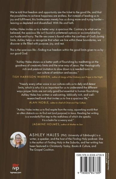 Society constantly tells us to follow our dreams and live our best lives. But contrary to what we've been told, the good life we crave is not accomplished through limitless possibilities or even hustle and hurry-it can only be found in the confines of God's loving limits. Inviting us to discover a better way, Ashley Hales shows us a spacious life filled with purpose, joy, and rest.