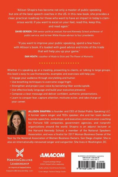 When you know what to say and how to say it, people listen. Find your powerful voice, and step into leadership. Speak with impact. Every day, you have an opportunity to use your voice to have a positive impact -- at work or in your community. You can inspire and persuade your audience -- or you can distract and put them to sleep. Presentation styles where leaders are nervous, ramble, and robotic can ruin a talk on even the most critical topics. As your performances become weak, your career prosects start to dim. To get ahead and make an impact, you need to deliver well-crafted messages with confidence and authenticity. You must?sound?as capable as you are. Public speaking is a skill, not a talent. With the right guidance, anyone can be a powerful speaker. Written by former opera singer turned CEO and TEDx speaker Allison Shapira, Speak with Impact unravels the mysteries of commanding attention in any setting, professional or personal. Whether it's speaking up at a meeting, presenting to clients, or talking to large groups, this book's easy-to-use frameworks, examples and exercises will help you: Engage your audience through storytelling and humor Use breathing techniques to overcome stage fright Strengthen and project your voice by banishing filler words/uptalk Use effective body language and build your executive presence Compose a clear message and deliver confident, authentic presentations Learn to conquer fear, capture attention, motivate action, and take charge of your career with?Speak with Impact.