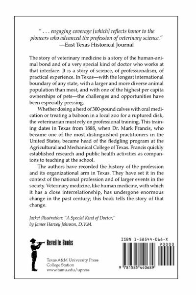 The story of veterinary medicine is a story of the human-animal bond and of a very special kind of doctor who works at that interface. It is a story of science, of professionalism, of practical experience. In Texas--with the longest international boundary of any state, with a larger and more diverse animal population than most, and with one of the highest per capita level of pet ownership--the challenges and opportunities have been especially great. Whether dosing a herd of three-hundred-pound calves with oral medication or treating a baboon in a local zoo for a ruptured disk, the veterinarian must rely on professional training. Such training has been available in Texas since 1888, when Dr. Mark Francis, eventually one of the most distinguished practitioners in the United States, became head of the fledgling program at the Agricultural and Mechanical College of Texas. Francis quickly established research and public health activities as companions to teaching at the school. To forge a working network and maintain standards, the state's veterinarians in 1903 formed the Texas Veterinary Medical Association (TVMA). From international campaigns to eradicate foot-and-mouth disease to ultra-sound applications for military working dogs and the examination of space-flight chimpanzees, the veterinary medicine profession in Texas has faced and met many challenges. It has expanded to practice medicine for the exotics imported into the state and to provide care for the companion animals increasingly bringing comfort to the elderly and disabled. Working from the archives of the TVMA and of Texas A&M University's College of Veterinary Medicine, the authors have recorded the history of the profession and its organizational arm in Texas. They have set it in the context of the national profession and of larger events in the society. Veterinary medicine, like human medicine, has undergone enormous change in the past century; this book tells the story of that change.