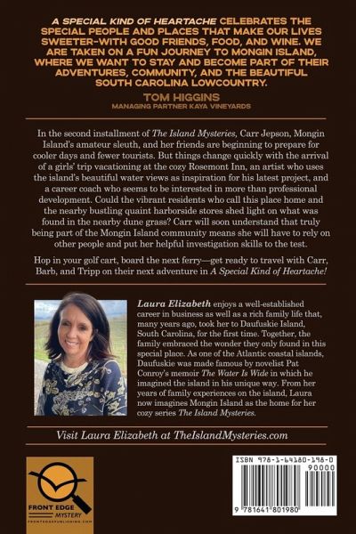 Welcome back to Mongin Island, the South Carolina Lowcountry home of Carr Jepson and her cozy Books & Brew bookstore, where tourists and long-time residents mingle over bestsellers, hot tea, and the latest island gossip. In the second installment of The Island Mysteries, Carr Jepson, Mongin Island's amateur sleuth, and her friends are beginning to prepare for cooler days and fewer tourists. But things change quickly with the arrival of a girls' trip vacationing at the cozy Rosemont Inn, an artist who uses the island's beautiful water views as inspiration for his latest project, and a career coach who seems to be interested in more than professional development. Could the vibrant residents who call this place home and the nearby bustling quaint harborside stores shed light on what was found in the nearby dune grass? Carr will soon understand that truly being part of the Mongin Island community means she will have to rely on other people and put her helpful investigation skills to the test. "Mongin Island sounds like a delightful place to live and visit. A beachy vibe with southern hospitality and charm. ... I can't wait for more stories from The Island Mysteries," writes Cynthia W. in her online review of Book #1, All Is Now Lost. Readers nationwide are eager for their return trip to this beautiful spot in the Atlantic. Sheila wrote, "Best book I've read in a while! Laura Elizabeth paints a picture with words to transport you and your senses to this wonderful island and its cast of characters. Well written, thoroughly enjoyable. I can't wait for book #2." Board the next ferry, hop in a golf cart, and get ready to travel with Carr, Barb, and Tripp in their latest Island Mystery adventure, A Special Kind of Heartache!