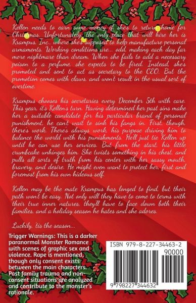 Kellen needs to earn some money if she's to return home for Christmas. Unfortunately, the only place that will hire her is Krampus, Inc., where she's supposed to help manufacture personal armaments. Working conditions are... odd, making each day far more nightmare than dream. When she fails to add a necessary poison to a perfume, she expects to be fired. Instead, she's promoted and sent to act as secretary to the CEO. But the promotion comes with claws, and won't result in the usual sort of overtime. Krampus chooses his secretaries every December 5th with care. This year, it's Kellen's turn. Having determined her past sins make her a suitable candidate for his particular brand of personal punishment, he can't wait to sink his fangs in. First, though, there's work. There's always work, his purpose driving him to balance the world with his punishments. He'll just tie Kellen up until he can use her services. But from the start, his little crumbcake unhinges him. She twists something in his chest, and pulls all sorts of truth from his center with her sassy mouth, bravery, and desire. He might even want to protect her, first and foremost from his own hideous self. Kellen may be the mate Krampus has longed to find, but their path won't be easy. Not only will they have to come to terms with their true inner natures, they'll have to face down both their families, and a holiday season he hates and she adores. Luckily, 'tis the season...