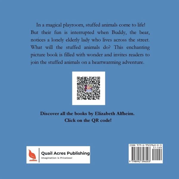 Whimsical watercolor illustrations bring to life a magical playroom where stuffed animals come alive! Freddie the Fox, Rosy the Rabbit, and Buddy the Bear enjoy their playful days in the children's playroom. But one day, Buddy notices something unexpected - a lonely elderly lady, Mrs. Benz, sitting sadly on her porch. This discovery throws their usual playtime into disarray. What will the stuffed animals do? How can they help Mrs. Benz feel better? And what if the children who play in the room discover their magical secret? This enchanting picture book, perfect for children, is filled with wonder and invites readers to join the stuffed animals on a heartwarming adventure.