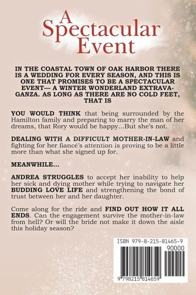 In the coastal town of Oak Harbor there is a wedding for every season, and this is one that promises to be a spectacular event- a winter wonderland extravaganza. As long as there are no cold feet, that is. You would think that being surrounded by the Hamilton family and preparing to marry the man of her dreams, that Rory would be happy...But she's not. Dealing with a difficult mother-in-law and fighting for her fiancé's attention is proving to be a little more than what she signed up for. Meanwhile... Andrea struggles to accept her inability to help her sick and dying mother while trying to navigate her budding love life and strengthening the bond of trust between her and her daughter. Come along for the ride and find out how it all ends. Can the engagement survive the mother-in-law from hell? Or will the bride not make it down the aisle this holiday season?