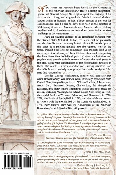 New Jersey has recently been hailed as the "Crossroads of the American Revolution." This is a fitting designation, given that General George Washington spent the majority of his time in the colony, and engaged the British in several decisive battles within its borders. In fact, a large portion of the War for Independence may be said to have been won in the counties of Middlesex, Somerset, Monmouth and Mercer, where shifting loyalties and local resistance on both sides presented a constant challenge to the combatants. Have all physical vestiges of the Revolution vanished from the Garden State? Not at all. In fact, the reader will be pleasantly surprised to discover that many historic sites still do exist, places that offer us a genuine glimpse into the Spirited War of the times. Donald Peck and his companion Jane Doherty lead us on an in-depth tour of many of these Midland sites, each interpreting the facts from their individual point of view. As historian and psychic, they provide a fresh analysis of events that took place in the area, along with explanations of the personalities involved in them. The result is a very readable and exciting narrative, one that affords us an entirely new perspective on the past that surrounds us. Besides George Washington, readers will discover that other Revolutionary War heroes were associated with Central New Jersey, among them Benjamin and William Franklin, John Adams, Aaron Burr, Nathaneal Greene, Charles Lee, and the Marquis de Lafayette. Numerous battles also took place on its soil, including Washington's Retreat across New Jersey in 1776, the crucial Battles of Trenton, Princeton, and Monmouth in 1776-1778, the Battle of Springfield in 1780, and the celebrated march to victory with the French, led by the Comte de Rochambeau, in 1781. New Jersey's truly was the "Crossroads of the American Revolution," and A Spirited War will prove it!
