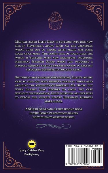 Magical baker Lillie Dean is settling into her new life in Silverkeep, along with all the creatures who'd come out of hiding after magic was made legal once more. The south side of town near the wharf is bustling with new neighbors, including merchant Jeremias Scarp, who's just procured a magical pendant that he swears is going to take his fledgling business to the next level. But when that pendant goes missing, Lillie's on the case to find out who might've taken it, while also avoiding the attention of powerful Mr. Globe. But when Sheriff Juno decides to close the case without investigation, Lillie must use all her wits to expose the culprit before Jeremias's business goes under. A Splash of Arcana is the second book in the Pobyd Perfections Bakery cozy fantasy mystery series.