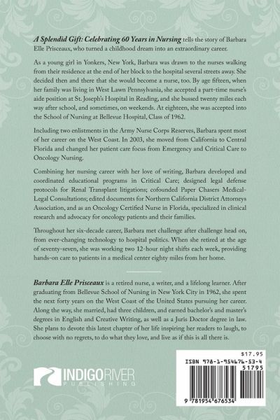 "A forthright, poignant, and heartwarming account of a storied and beloved career in nursing." - Kirkus Reviews "...a powerful memoir that holds the uncommon ability to transcend personal experience alone..." - Midwest Book Review A Splendid Gift: Celebrating 60 Years in Nursing tells the story of Barbara Elle Prisceaux, who turned a childhood dream into an extraordinary career. As a young girl in Yonkers, New York, Barbara was drawn to the nurses walking from their residence at the end of her block to the hospital several streets away. She decided then and there that she would become a nurse too by age fifteen, when her family was living in West Lawn Pennsylvania, she accepted a part-time nurse's aide position at St. Joseph's Hospital in Reading, and she bused twenty miles each way after school, and sometimes, on weekends. At eighteen, she was accepted into the School of Nursing at Bellevue Hospital, Class of 1962. Including two enlistments in the Army Nurse Corps Reserves, Barbara spent most of her career on the West Coast. In 2003, she moved from California to Central Florida and changed her patient care focus from Emergency and Critical Care to Oncology Nursing. Combining her nursing career with her love of writing, Barbara developed and coordinated educational programs in Critical Care; designed legal defense protocols for Renal Transplant litigations; cofounded Paper Chasers Medical-Legal Consultations; edited documents for Northern California District Attorneys Association, and as an Oncology Certified Nurse in Florida, specialized in clinical research and advocacy for oncology patients and their families. Throughout her six-decade career, Barbara met challenge after challenge head-on, from ever-changing technology to hospital politics. When she retired at the age of seventy-seven, she was working two 12-hour shifts each week, providing hands-on care to patients in a medical center eighty miles from her home.