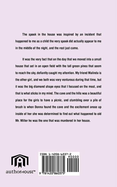 The spook in the house was inspired by an incident that happened to me as a child the very spook did actually appear to me in the middle of the night, and the rest just came. It was the very fact that on the day that we moved into a small house that set in an open field with the tall green pines that seem to reach the sky, defiantly caught my attention. My friend Malinda is the other girl, and we both was very venturous during that time, but it was the big diamond shape eyes that I focused on the most, and that is what sticks in my mind. The cave and the hills was a beautiful place for the girls to have a picnic, and stumbling over a pile of brush is when Donna found the cave and the excitement arose up inside of her she was determined to find out what happened to old Mr. Miller he was the one that was murdered in her house.